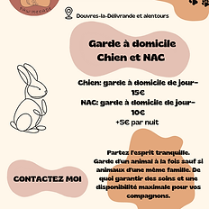 Garde de votre chien ou de votre NAC directement à mon domicile. Possibilité de garder votre animal en journée et/ou la nuit. Garde d'un animal à la fois sauf si animaux de la même famille.